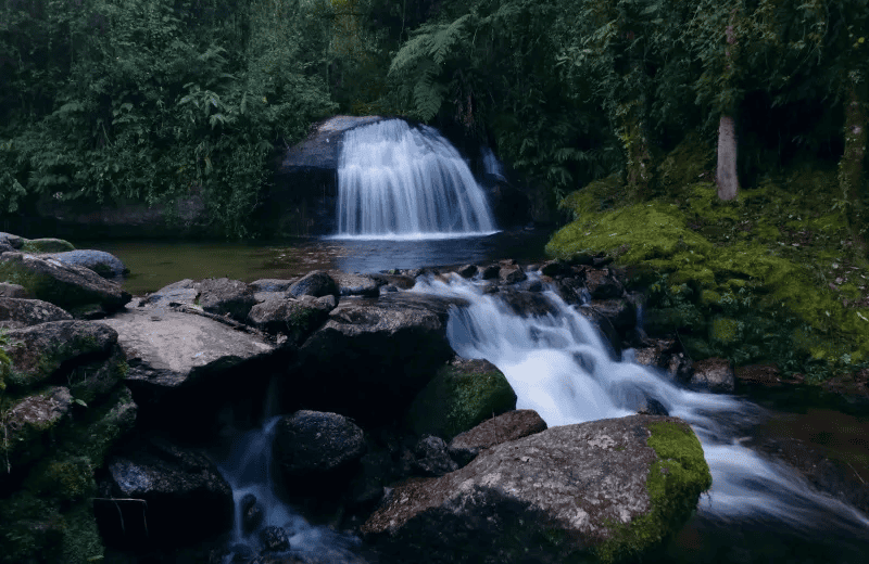 Jeep tour com rota das cachoeiras, histórias de Visconde e visita a Maringá, incluindo almoço e feira de artesanato.